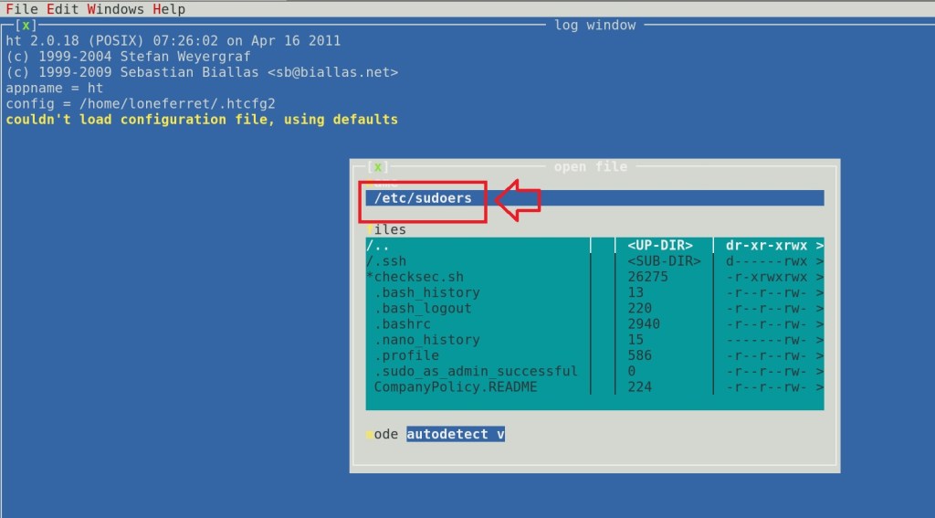 Setelah melakukan penelusuran lebih lanjut. Kita menemukan beberapa hal menarik pada home folder milik user loneferret, yaitu adanya file bernama CompanyPolicy.Readme. Di dalam file tersebut disebutkan bahwa Lead Programmer (loneferret) harus menggunakan program bernama “ht” untuk membuat, melihat dan melakukan editing pada file. Apabila menggunakan program lain, maka akan ada sanksi manajemen. Perhatikan perhatikan eksekusi perintah berikut: