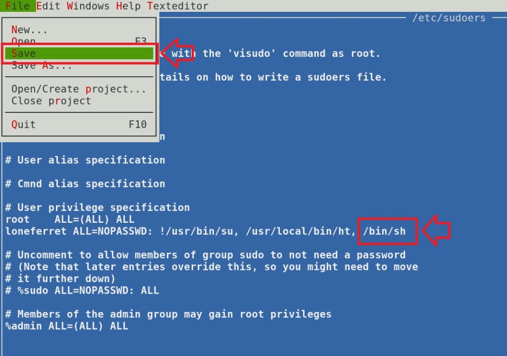 Maka langkah selanjutnya adalah kita akan menjalankan program “ht” dan menyunting file /etc/sudoers untuk memberikan hak akses root pada program /bin/sh. Setelah hal tersebut kita berhasil meningkatkan hak akses menjadi root, sebagaimana langkah-langkah pada gambar berikut ini: