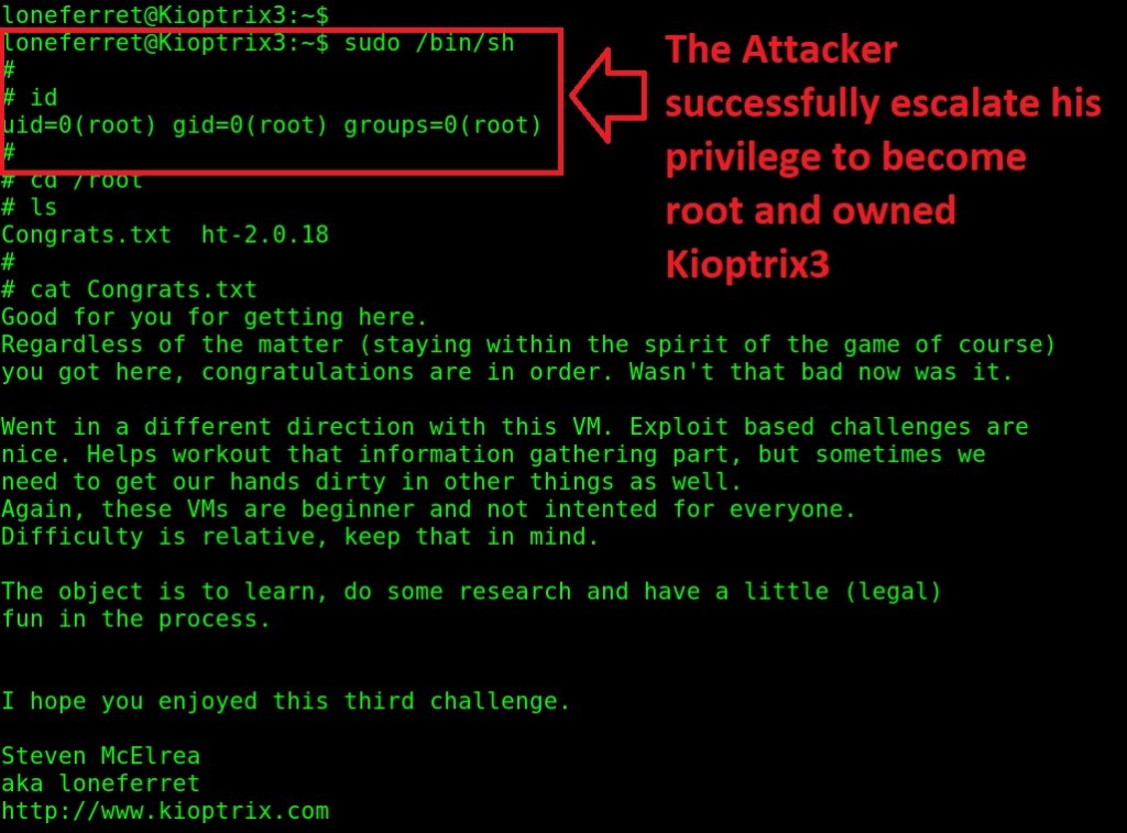 Pelajaran penting dari kisah serial Kioptrix bagian ketiga ini adalah seorang penyerang “sangat lapar” dengan credential. Diawali dari melakukan serangan terhadap layanan SSH dengan brute force untuk mendapatkan credential milik loneferret. Selanjutnya berhasil mengambil alih credential milik root untuk menguasai server secara keseluruhan dengan memanipulasi hak akses SUID pada program “ht”.
