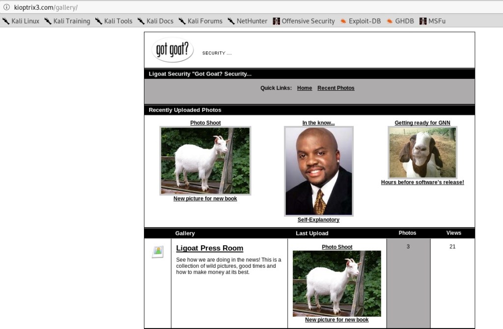 Dengan bantuan nikto, dirb dan burpsuite kita mendapatkan cukup banyak file dan folder pada mesin Kioptrix-03. Namun demikian hanya ada tiga temuan yang menarik untuk ditelusuri lebih lanjut yaitu folder gallery kemudian phpmyadmin dan login form pada aplikasi LotusCMS (index.php). Perhatikan beberapa gambar berikut ini, khusus untuk folder gallery agar dilakukan penambahan kioptrix3.com pada file /etc/hosts dengan merujuk pada alamat IP Address dari Kali Linux milik kita.